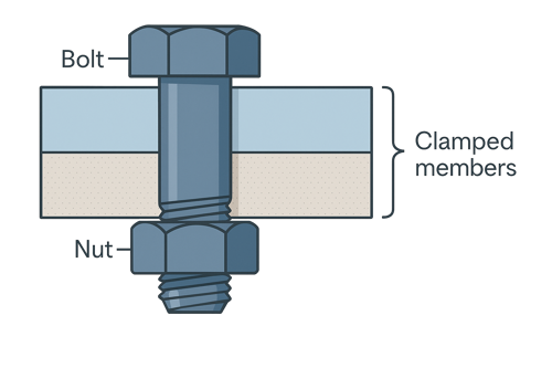 A bolted joint is a connection that uses a bolt and a mating thread (a nut or tapped hole) to clamp two or more parts together. Tightening stretches the bolt like a spring and compresses the jointed parts; this elastic stretch creates preload (clamp force) that holds the assembly together and resists service loads.