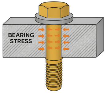 Bearing stress is the localized compressive stress that develops when a fastener, such as a bolt, rivet, or pin, presses against the wall of the hole it is fitted into. This type of stress is especially important in structural and mechanical joints, because if it becomes too high, the hole can deform, elongate, or even cause the surrounding material to fail. Bearing stress only occurs in the region where the fastener makes contact with the hole, and the pressure is not evenly distributed—typically, the highest concentration of stress is found at the edge of the hole in the direction of the applied force.