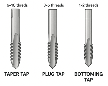 When compared to other taps, the difference becomes clearer. A taper tap has a long chamfer covering about 6 to 10 threads, which makes it ideal for starting the threading process in a hole. A plug tap, with its medium chamfer of 3 to 5 threads, is typically used after the taper tap to advance the threads further. The bottoming tap, with just 1 to 2 chamfered threads, is used last in the sequence to complete the threads nearly to the bottom of the hole.