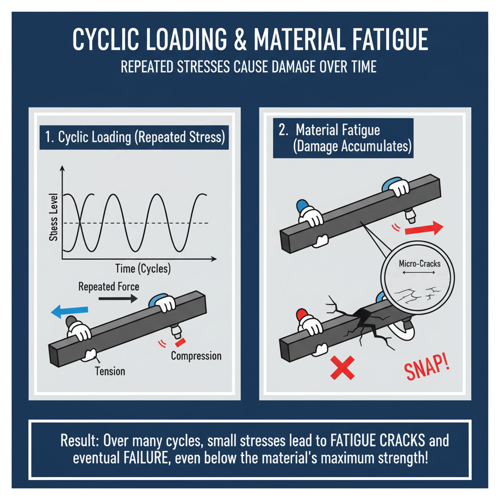 Cyclic loading refers to the process of repeatedly applying and removing stresses or strains to a material or structure over time — a pattern that causes the stress state to vary in a regular, cyclic manner. This can involve tension and compression, bending, torsion, or any combination of these forces.