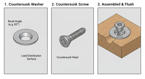 Countersunk washers are often used in applications where aesthetics and secure fastening are both important, such as furniture, aerospace components, and precision assemblies. In fastener and mechanical contexts, they are especially useful when the workpiece cannot be easily countersunk, or when additional strength and surface protection are required at the fastener interface.