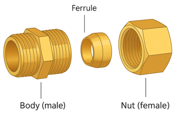 In a compression fitting, the nut works together with a ferrule (also called an olive) and the fitting body. The compression nut threads onto the body of the fitting and, as it is tightened, it forces the ferrule to compress around the outside diameter of the pipe or tube. This compression creates a secure mechanical grip and a pressure-tight seal between the tube and the fitting.