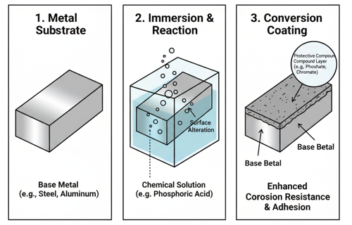 Conversion coating is a chemical treatment applied to the surface of metals to enhance corrosion resistance, improve paint adhesion, and sometimes provide lubrication. Unlike simple coatings that add a separate layer on top of the metal, conversion coatings work by chemically altering the metal’s surface itself, creating a thin, protective compound layer that bonds directly to the substrate. This makes the finish more durable and resistant to chipping or peeling compared to applied coatings like paint.