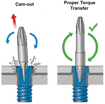 In mechanics, cam-out is when a driver bit slips out of a screw head while torque is applied. It usually happens because of excess torque, poor bit seating, or drive designs that encourage slipping (like Phillips). Cam-out wastes torque, damages fasteners and tools, and is why drive styles like Torx or hex are often preferred for higher torque applications.