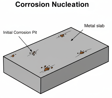 When a metal is exposed to an aggressive environment (such as moisture, salts, acids, or other electrolytes), small electrochemical cells form on the surface. Certain areas act as anodic sites, where metal atoms begin to lose electrons and dissolve, while surrounding areas act as cathodic sites, where reduction reactions occur. This uneven distribution of activity causes specific points to become the “nuclei” or seeds of corrosion.
