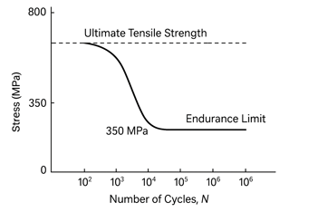 As an example: Consider a medium-carbon steel bolt with an ultimate tensile strength (UTS) of 800 MPa. The endurance limit for steels is typically around 40–50% of UTS. In this case, the endurance limit would be approximately 320–400 MPa. If the bolt is subjected to a cyclic tensile stress of 300 MPa, it should survive millions of cycles without failure. But if the applied cyclic stress is 450 MPa, the bolt may eventually fail from fatigue even though 450 MPa is well below the 800 MPa tensile strength. Factors like surface finish, corrosion, thread design, and preload can reduce the effective endurance limit in real-world applications.