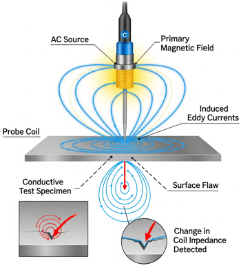 Eddy Current Testing (ECT) is a non-destructive testing (NDT) method that relies on electromagnetic induction to detect flaws in conductive materials. A probe containing a coil is energized with alternating current, which generates a changing magnetic field. When the probe is brought near a conductive material, this field induces circulating electrical currents—called eddy currents—at the surface. These eddy currents in turn produce their own opposing magnetic fields, which alter the electrical impedance of the probe’s coil. If the material is free from defects, the eddy currents flow in a predictable way. However, when there is a discontinuity such as a crack, corrosion pit, or thinning of the material, the flow of eddy currents is disrupted, and the resulting change in coil response is measured and displayed on an instrument.