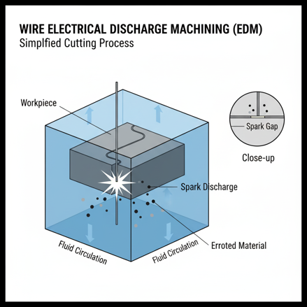There are several main types of EDM. Die-Sinking EDM (or Ram EDM) uses a shaped electrode that is pressed into the workpiece to create a cavity of the same form, which is commonly used for molds and dies. Wire EDM relies on a thin, continuously fed brass wire electrode to cut through a workpiece in a manner similar to a bandsaw, producing fine and accurate cuts. Hole Drilling EDM is specialized for making very small, deep holes by using tubular electrodes.