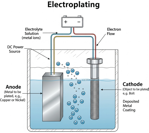 A manufacturing process that uses an electric current to deposit a thin, adherent layer of a desired metal onto the surface of a fastener. This metallic coating is applied to enhance various properties, including corrosion resistance, wear resistance, hardness, conductivity, and appearance. Common electroplated finishes for fasteners include zinc, nickel, chrome, and cadmium.