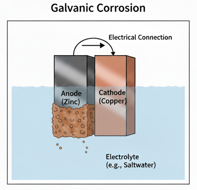 The severity of galvanic corrosion is influenced by several conditions. The greater the difference in electrochemical potential between the two metals, the faster corrosion will occur. The conductivity of the electrolyte also plays a major role, with saltwater being particularly aggressive in accelerating the process. Additionally, the relative size of the metals in contact affects the outcome; a small anode connected to a large cathode will corrode at a much faster rate due to the disproportionate distribution of current.
