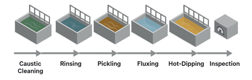 Once the steel is clean, it enters the fluxing stage. Here, the steel is dipped into a flux solution, typically zinc ammonium chloride (ZnCl₂ + NH₄Cl), which coats the surface. The flux prevents oxidation before immersion in molten zinc and helps ensure proper bonding between the steel and zinc during galvanizing. In some cases, a dry flux layer is applied and dried on the steel surface. When this method is used, a drying step may follow to reduce spattering when the steel is submerged into the molten zinc bath.
