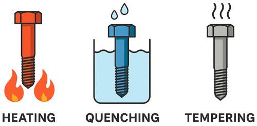 Heat treating a fastener is the process of heating and cooling it under controlled conditions to alter its internal structure and improve performance. By doing this, manufacturers can increase hardness, tensile strength, toughness, and resistance to wear or fatigue, ensuring the fastener can handle demanding applications without premature failure.