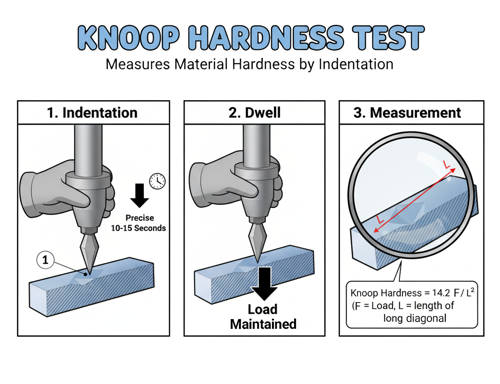 Unlike macroscopic hardness tests that use larger loads and indenters, the Knoop test uses a very light load (typically between 10 and 1000 grams-force) and an elongated diamond-shaped indenter. The indenter is rhombohedral, with one diagonal much longer than the other (about a 7:1 ratio). This unique shape allows for shallow indentations, making it ideal for testing thin coatings or brittle materials without causing cracking or substrate influence.