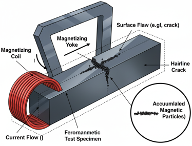 Magnetic Particle Testing (MT) is a non-destructive testing (NDT) technique designed to detect surface and near-surface defects in ferromagnetic materials like iron, nickel, cobalt, and their alloys. The process begins by magnetizing the part either through direct current or by placing it in a magnetic field. When the material contains a discontinuity—such as a crack, seam, lap, or void—it interrupts the flow of the magnetic field. This disruption causes magnetic flux leakage at the defect site, which provides the basis for detection. Finely milled ferromagnetic particles, applied as either a dry powder or a suspension in liquid, are then spread across the surface. These particles are drawn toward the leakage fields and cluster along the defect, forming a visible indication of its presence.