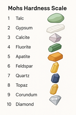 The Mohs Hardness Scale is a comparative scale that measures the relative hardness of minerals and other materials based on their ability to resist scratching. It was developed in 1812 by German mineralogist Friedrich Mohs and is still widely used today as a quick, practical way to rank material hardness. The scale ranges from 1 to 10, with 1 being the softest and 10 the hardest. Each mineral on the scale can scratch any material ranked lower than itself, but not those higher.