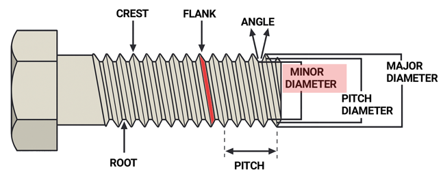 The minor diameter is important because it directly affects the strength of the fastener. Since this dimension determines the thickness of the metal left at the root of the thread, it defines how much shear area is available to resist stripping. A larger minor diameter means more material in the cross-section and generally higher strength, while a smaller one means the fastener may be weaker.