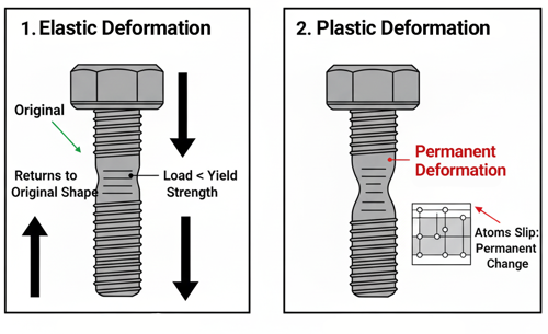 For example, when a bolt is tightened past its yield strength, it begins to stretch permanently — its diameter may slightly reduce, and the threads might elongate. If the load continues to increase, the bolt eventually “necks” and fractures. This behavior demonstrates the material’s transition from elastic to plastic deformation, showing how stress can permanently alter its geometry.