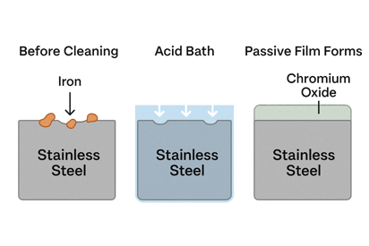 Passivation is a chemical process used to improve the corrosion resistance of metals, especially stainless steel and other alloys. Even though stainless steel already contains chromium, which naturally forms a thin oxide layer that protects it from rusting, the surface can still be contaminated with free iron or other impurities during machining, forming, or handling. These contaminants can make the metal more vulnerable to localized corrosion if not removed.