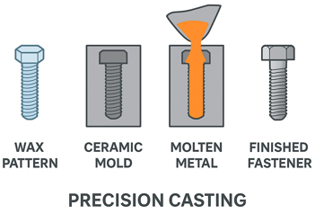 Precision casting, often called investment casting or the lost-wax process, is a manufacturing method used to create fasteners and other components with very fine detail, smooth surfaces, and tight dimensional tolerances.