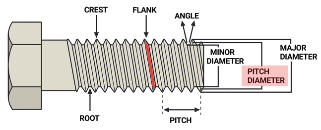 The pitch diameter of a thread is the imaginary diameter of a cylinder that passes through the threads at the point where the width of the thread ridge (the crest to the flank) and the width of the thread groove (the flank to the root) are exactly equal. In other words, it’s the “midpoint” between the major diameter (the outer crest) and the minor diameter (the inner root) of the thread profile.