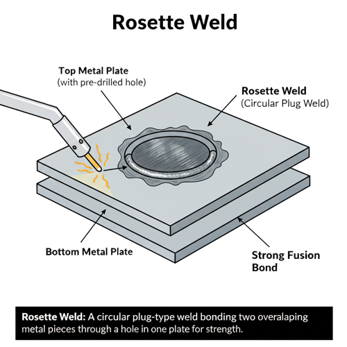 A rosette weld (also known as a plug weld) is a circular spot weld used to join two overlapping metal components by filling a pre-drilled or punched hole in the top sheet with molten metal that fuses to the surface beneath it. Once cooled, the weld forms a strong, localized bond that resembles a small circular “rosette” pattern—hence the name.