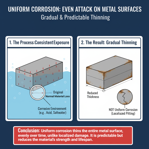 Uniform corrosion is the most common and predictable form of metallic corrosion, characterized by the even and consistent attack of a metal surface over a large area. In this process, the corrosion reaction occurs uniformly across the exposed surface, causing the metal to thin gradually and evenly rather than developing localized pits or cracks.