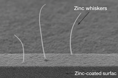 Zinc whiskers are tiny, hair-like metallic filaments that can spontaneously grow from surfaces coated with zinc, such as galvanized steel, zinc-plated fasteners, or zinc-coated flooring panels. They typically form over time due to internal stresses in the zinc coating, such as those caused by electroplating, oxidation, or mechanical strain.