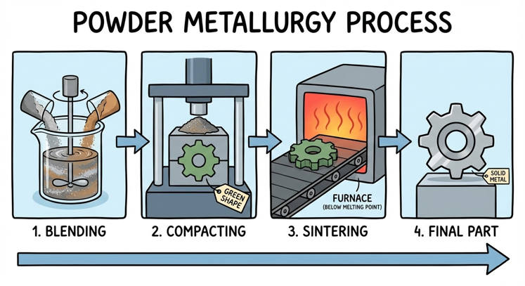 Powder metallurgy (PM) is a manufacturing method where you make metal parts from metal powders instead of melting a bulk ingot and machining it down. In its classic form, PM means you blend a controlled powder mix, compact it in a die into a “green” (unsintered) shape, then sinter it—heating it to a temperature below the main metal’s melting point so the powder particles bond together into a solid part.