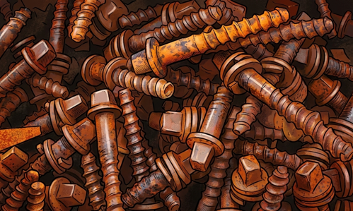 A destructive, reddish-brown corrosion that forms on iron or steel fasteners due to exposure to oxygen and moisture weakening their structure and impeding function. It is commonly mitigated by the use of protective finishes or corrosion-resistant materials, like stainless steel.