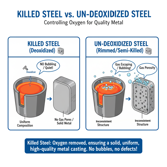 Killed steel is a type of fully deoxidized steel in which oxygen is almost completely removed from the molten metal before it solidifies. This process prevents gas evolution during solidification, ensuring a uniform composition and eliminating gas porosity or blowholes in the finished product. The term “killed” comes from the idea that the steel has been “quieted” — it doesn’t bubble or effervesce while cooling in the mold, unlike rimmed or semi-killed steels.